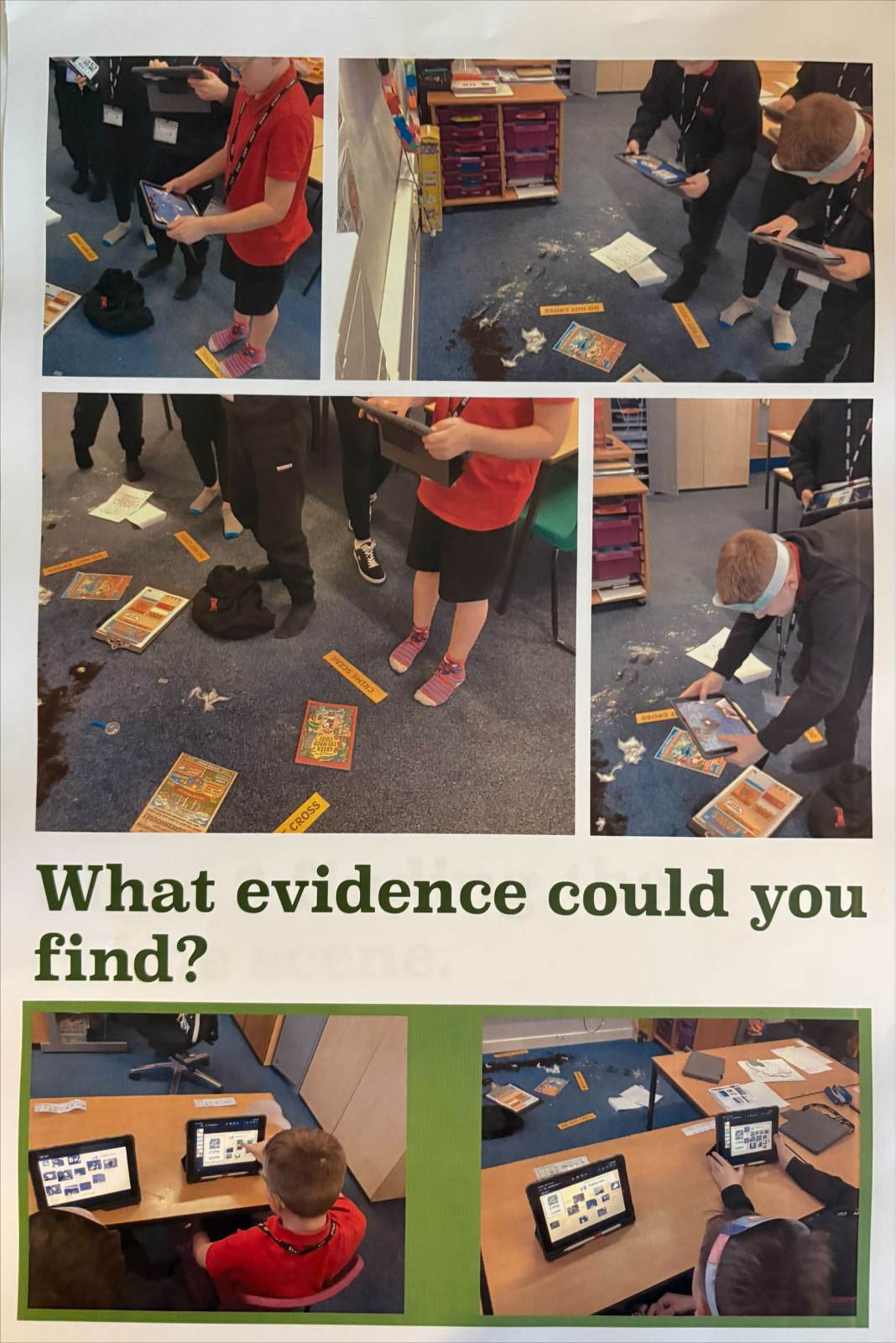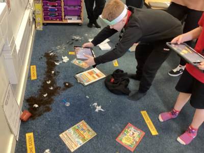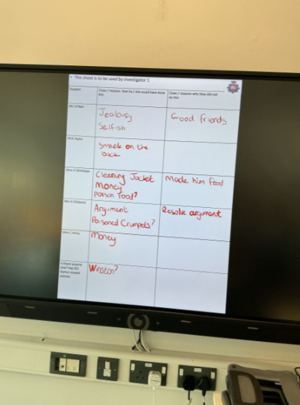 During English sessions, replacing the usual Talk for Writing lesson for the day, pupils examined clues, analysed information, and began forming their theories. They worked independently or in pairs to dig deep into a set of literacy resources that would reveal the killer!