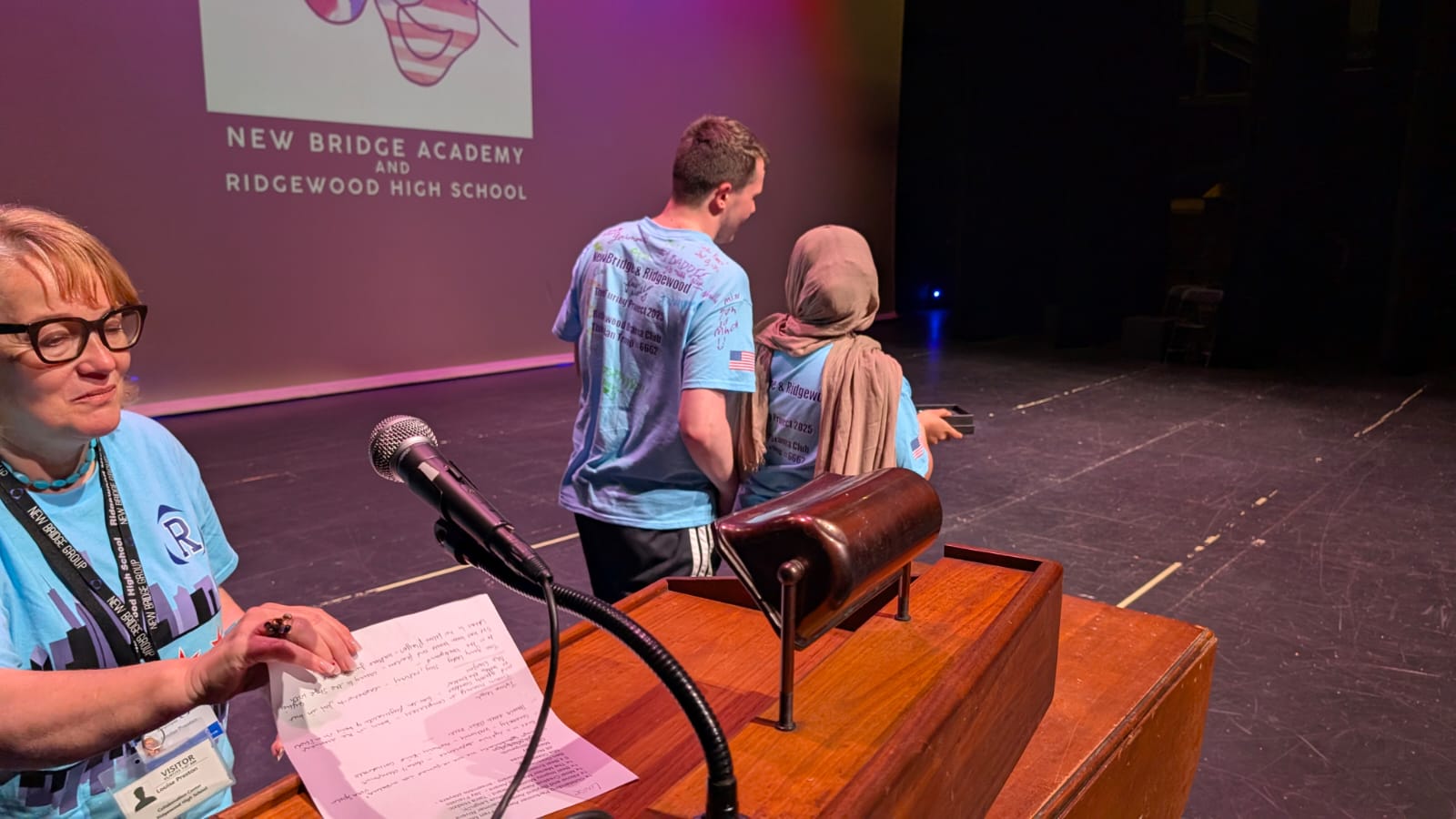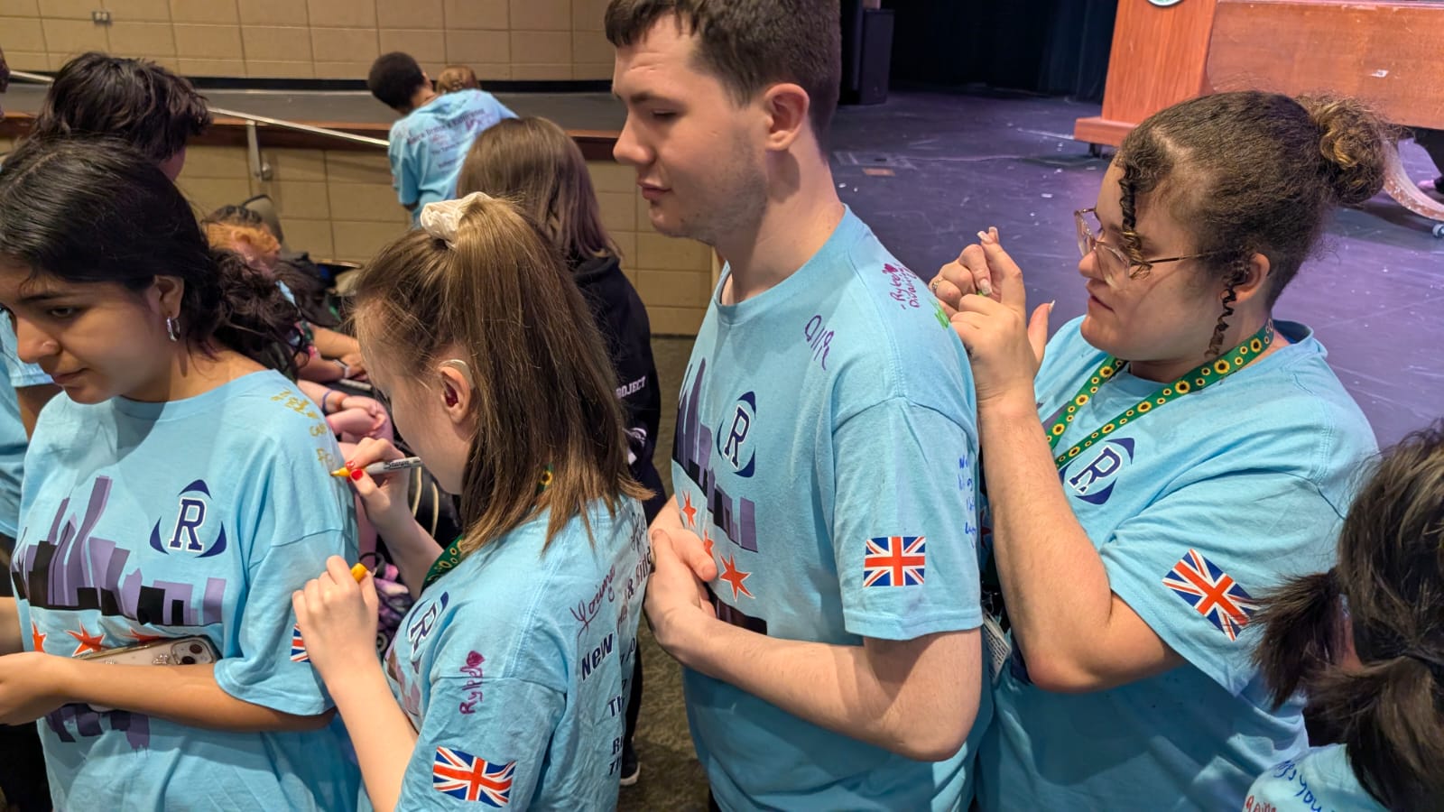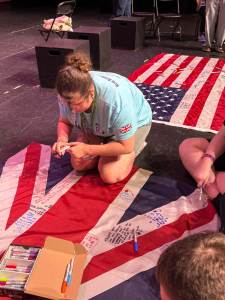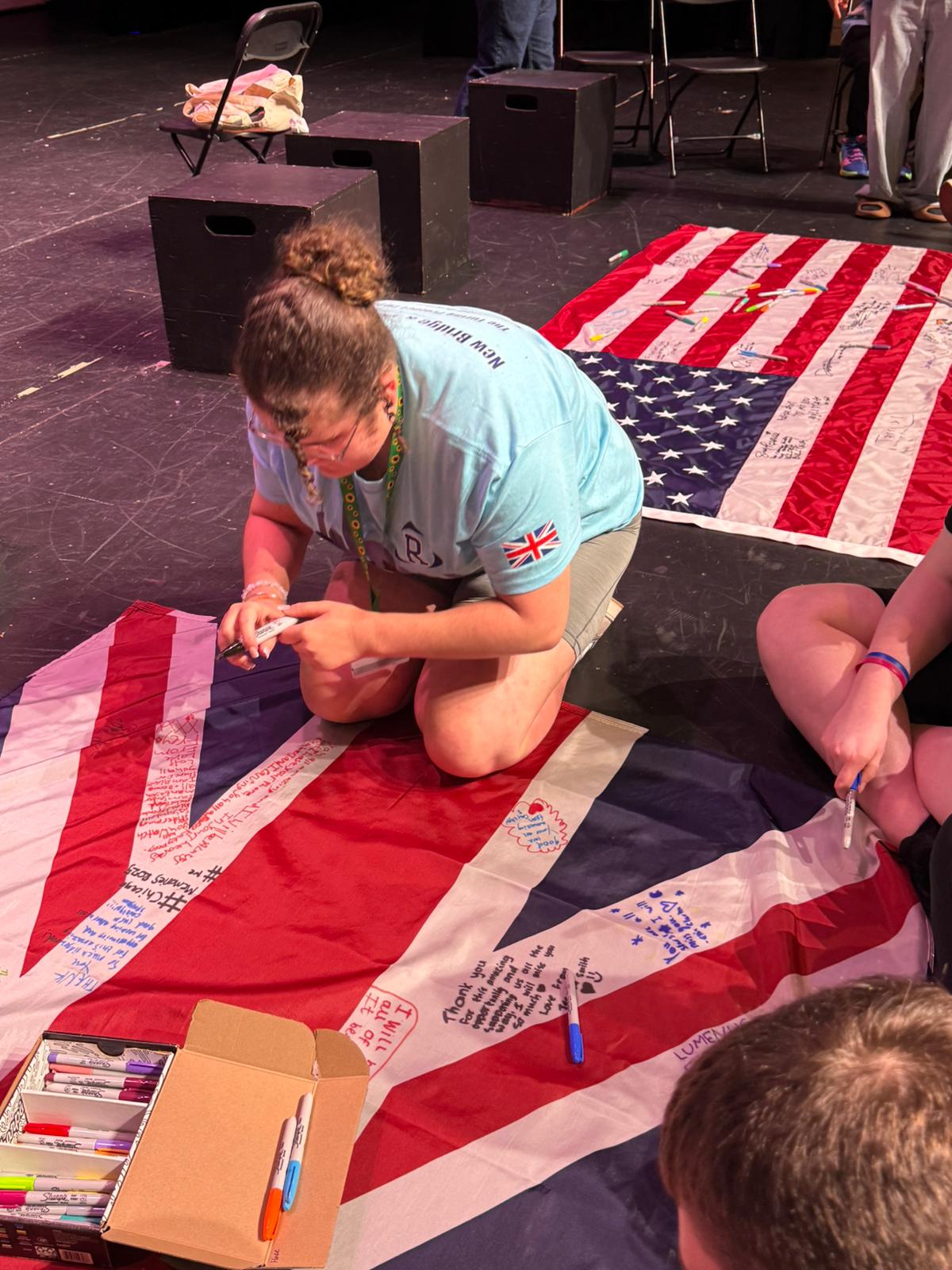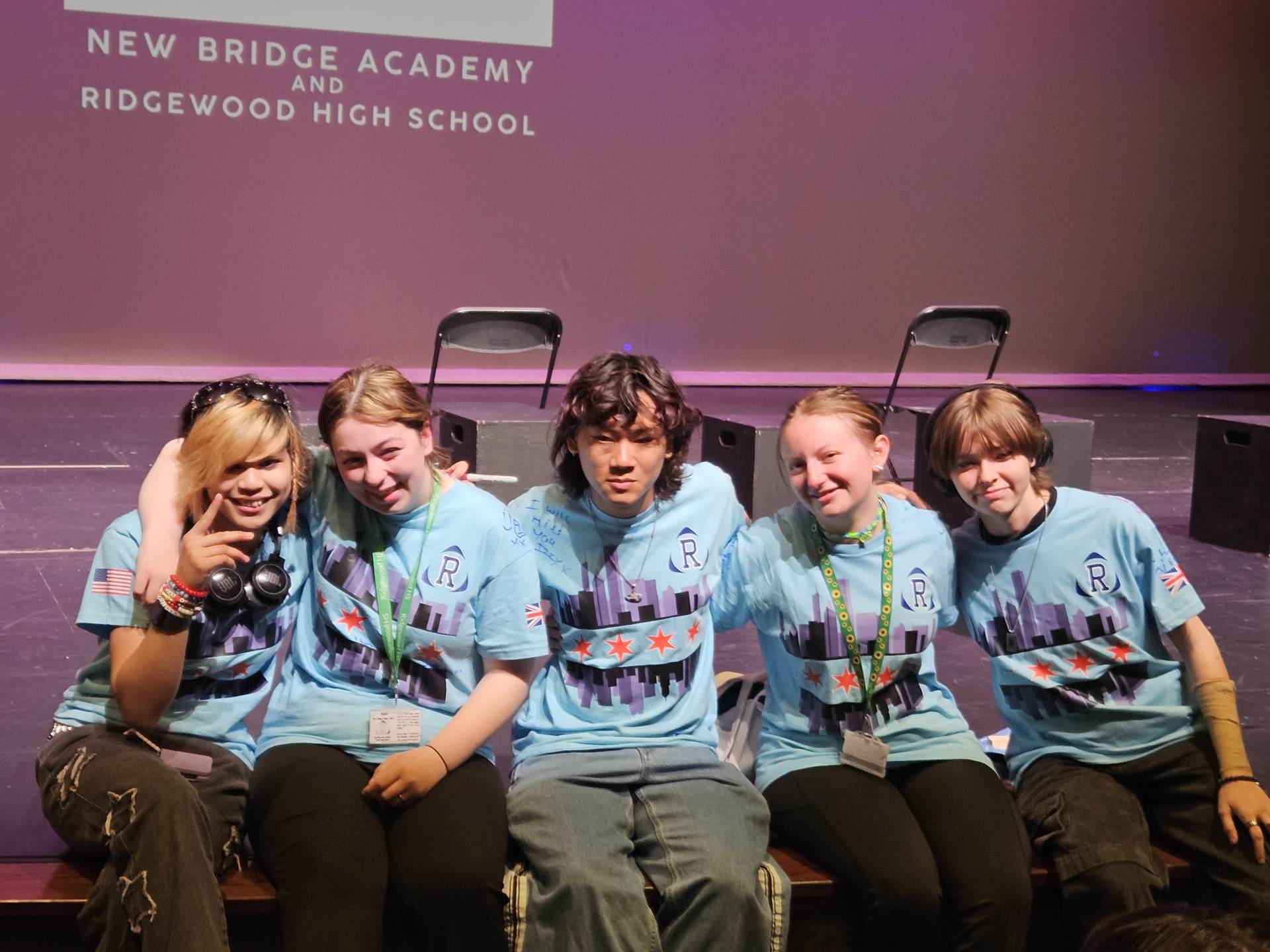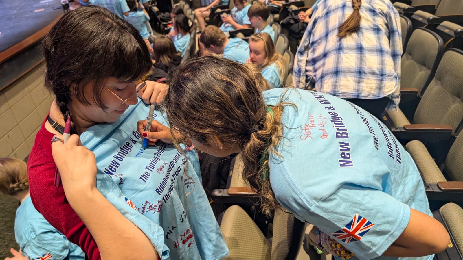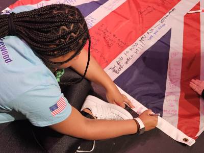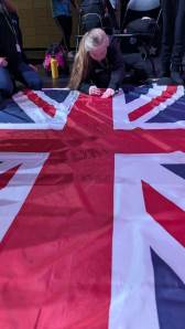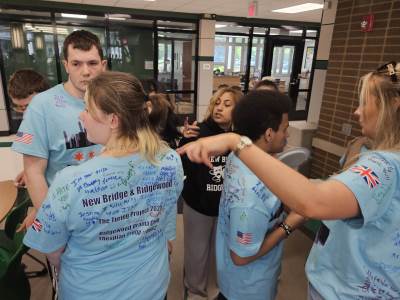 During the first section of the morning, New Bridge and Ridgewood students signed each other’s t-shirts, took selfies and lots of photographs, and the New Bridge students signed a Union Jack flag which was given to Ridgewood. In turn, Ridgewood students signed an American flag and presented it to us.