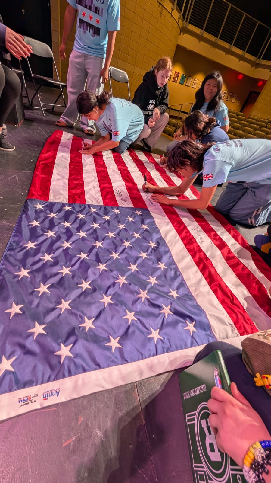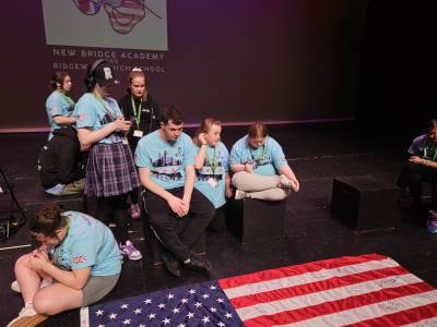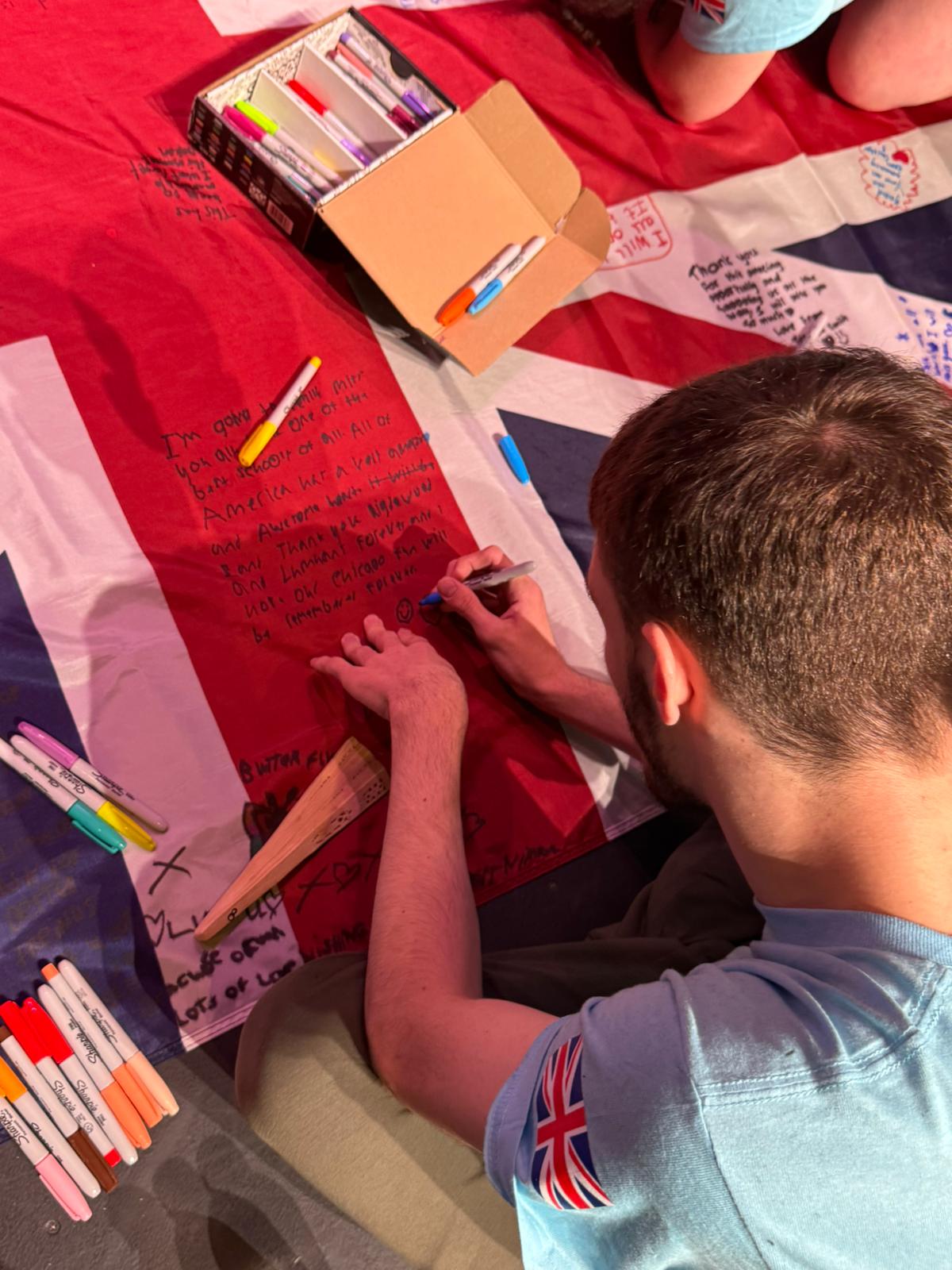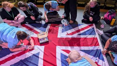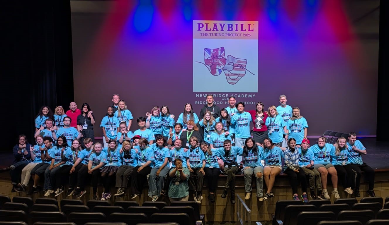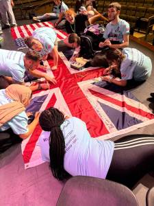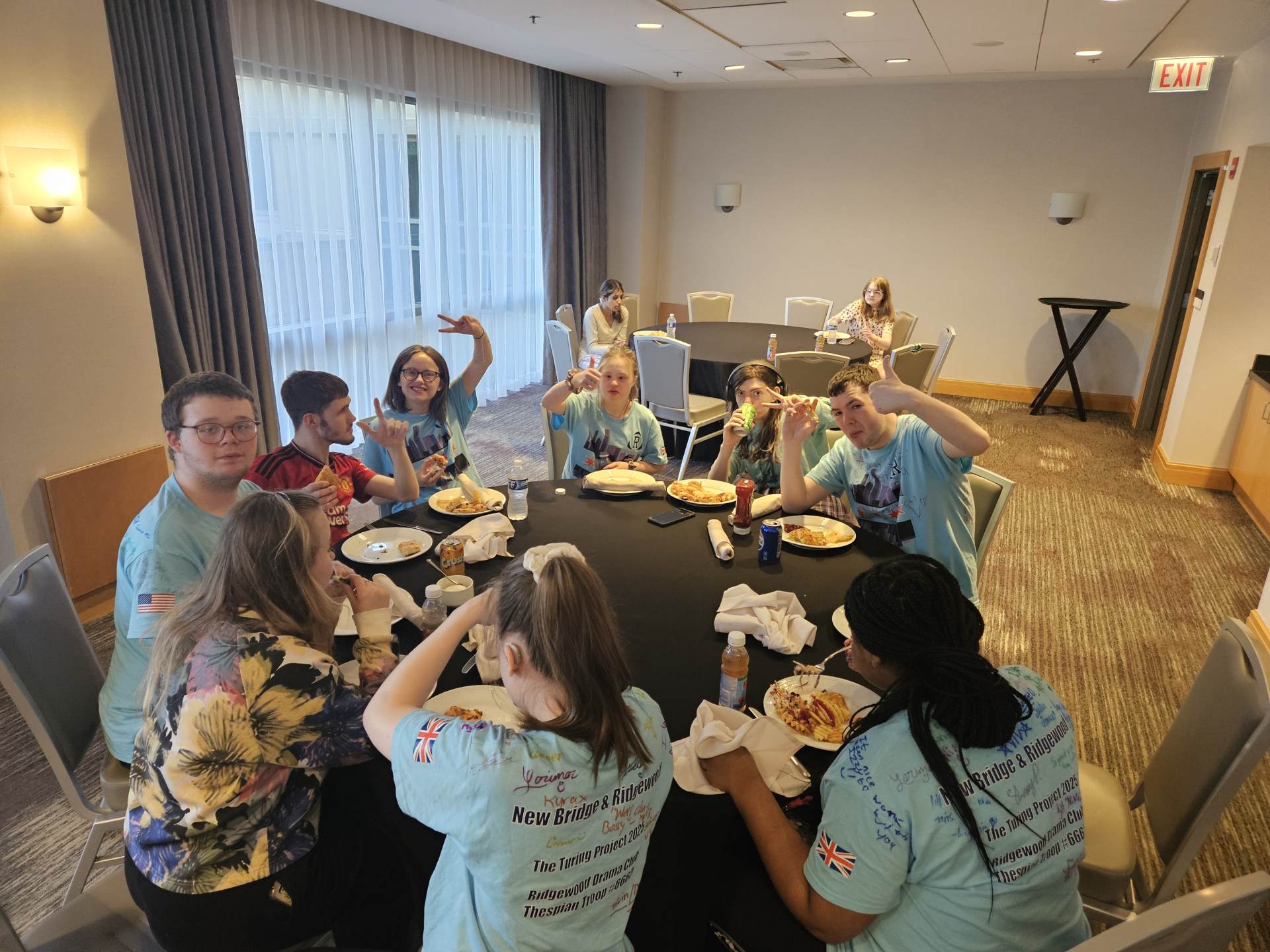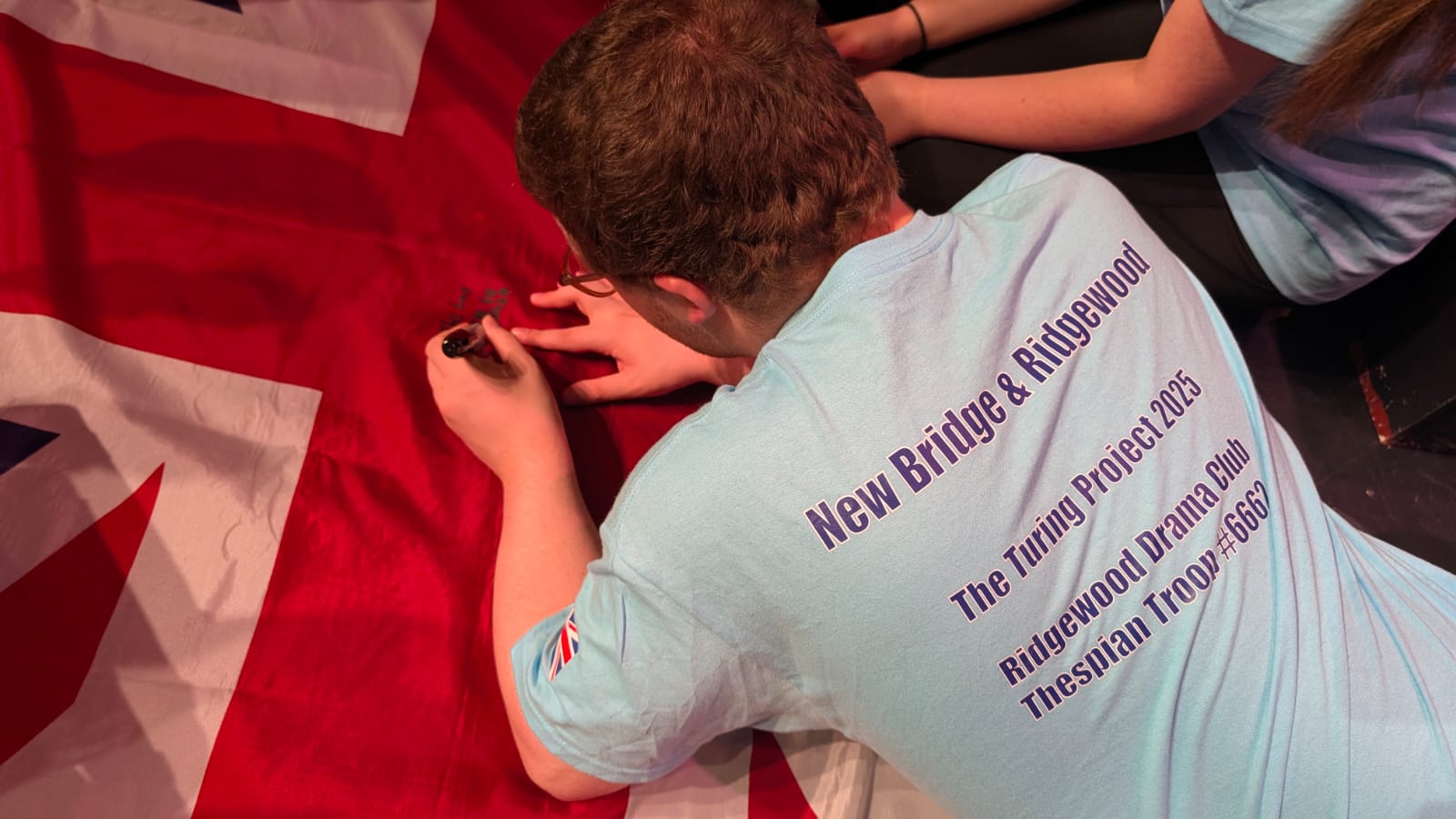 During the first section of the morning, New Bridge and Ridgewood students signed each other’s t-shirts, took selfies and lots of photographs, and the New Bridge students signed a Union Jack flag which was given to Ridgewood. In turn, Ridgewood students signed an American flag and presented it to us.