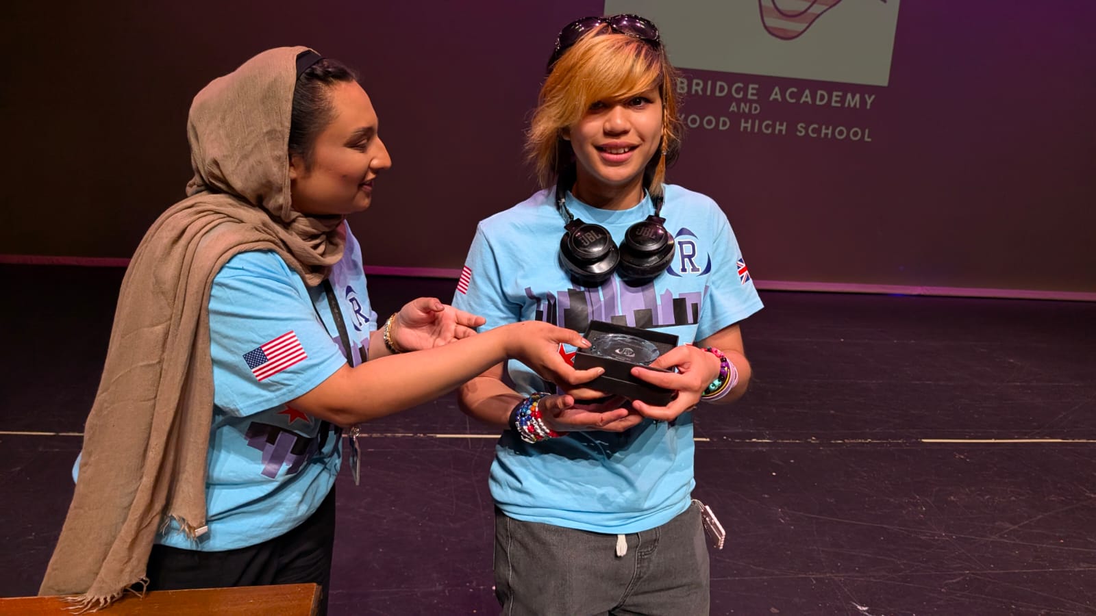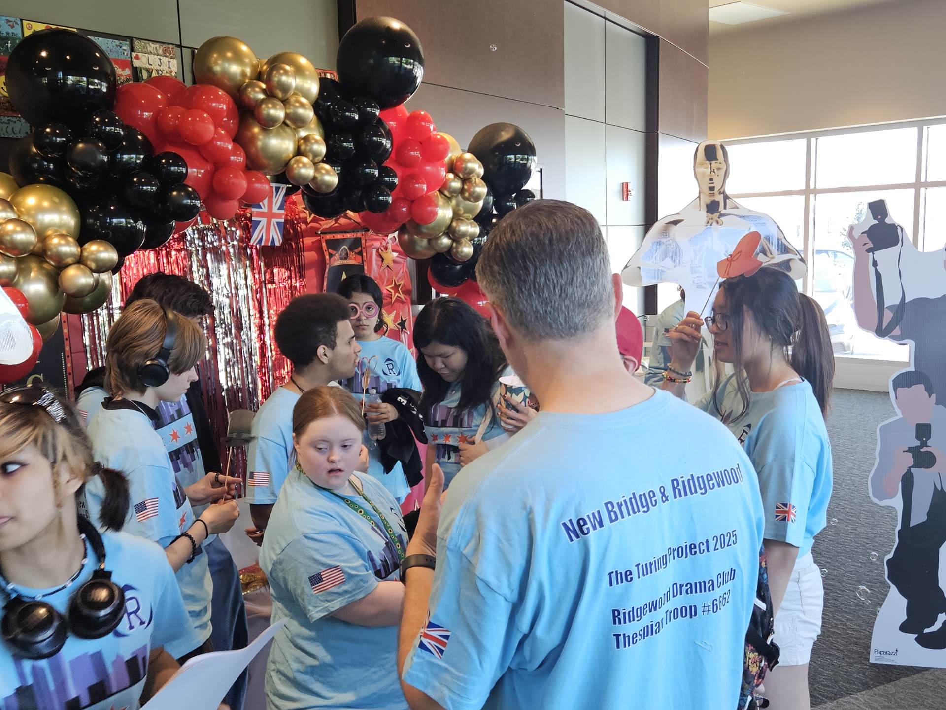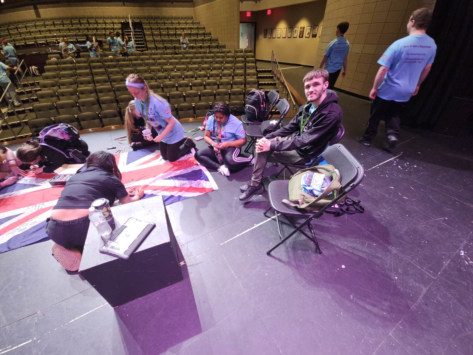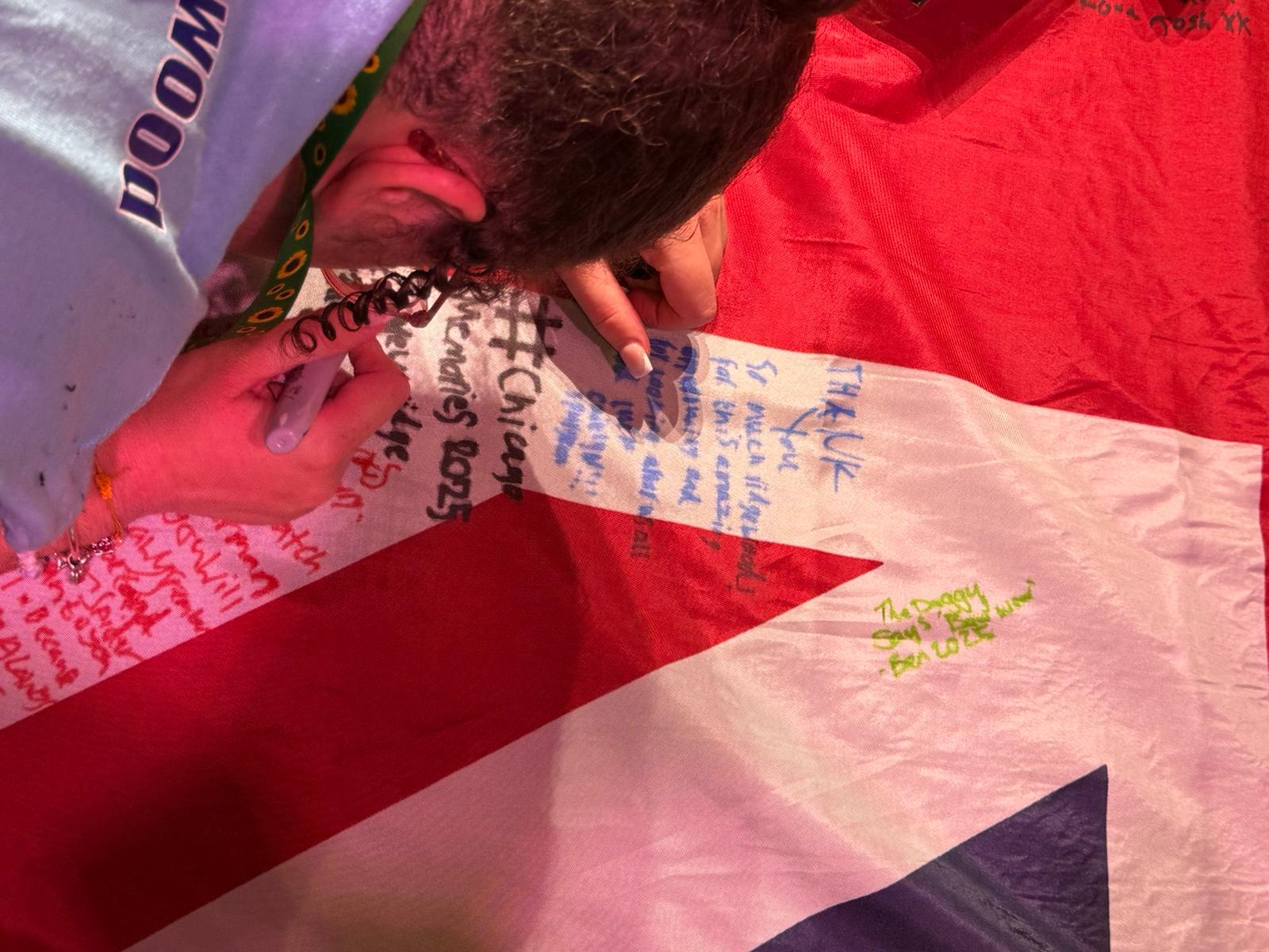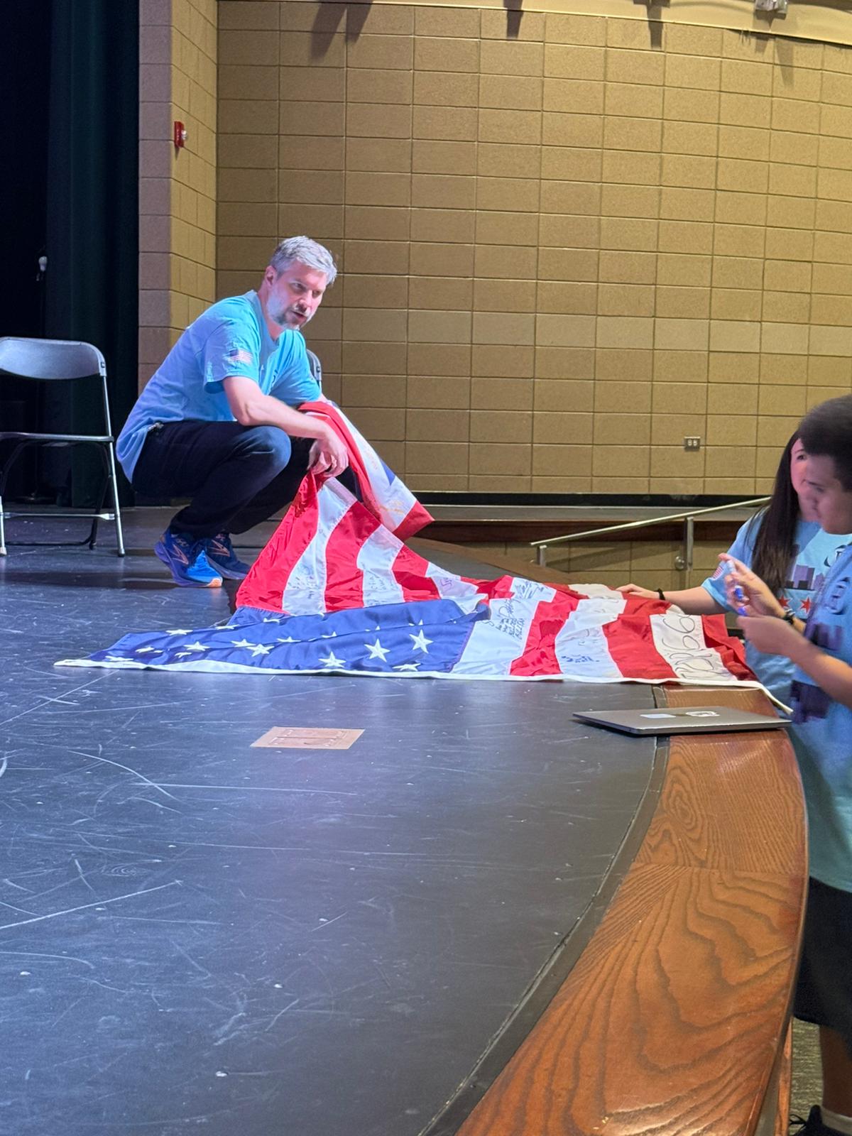 During the first section of the morning, New Bridge and Ridgewood students signed each other’s t-shirts, took selfies and lots of photographs, and the New Bridge students signed a Union Jack flag which was given to Ridgewood. In turn, Ridgewood students signed an American flag and presented it to us.