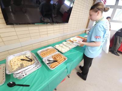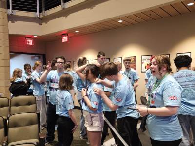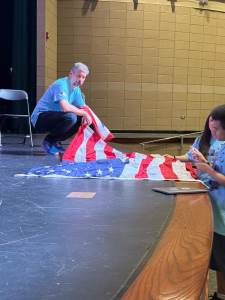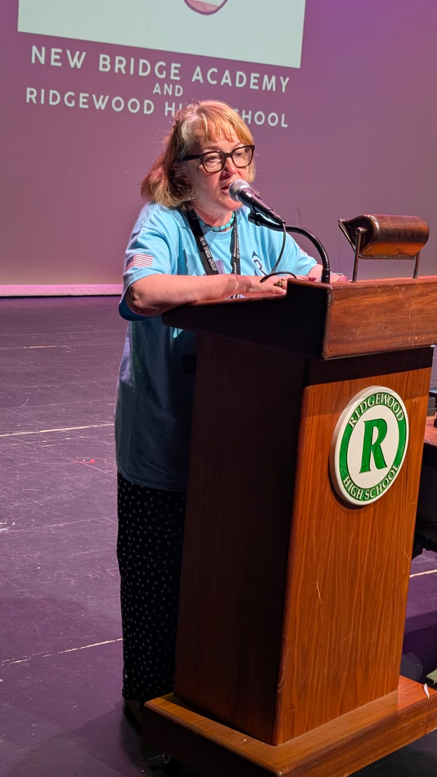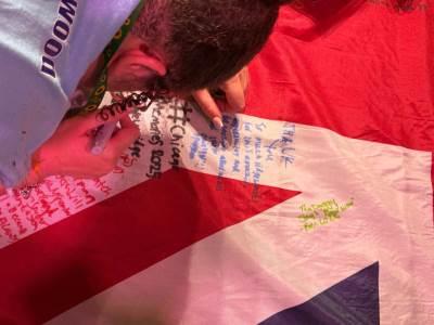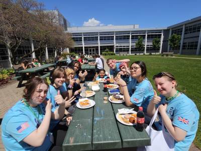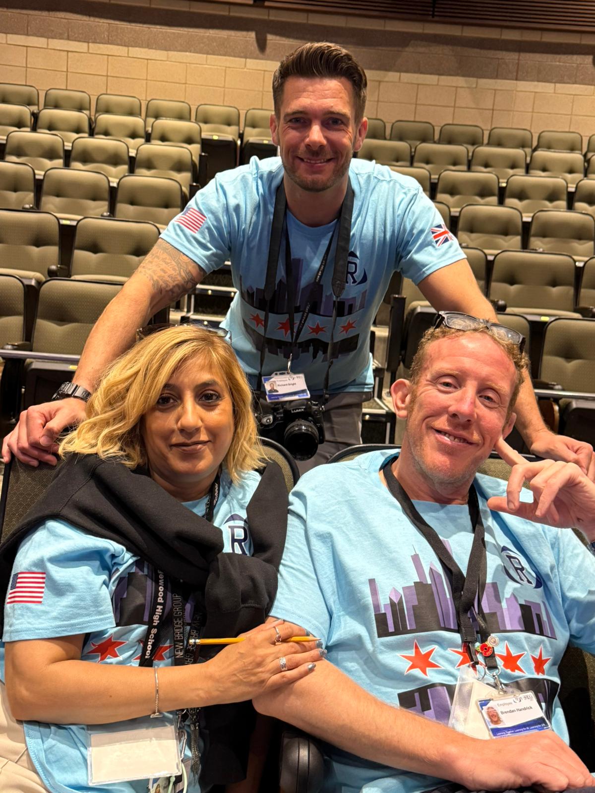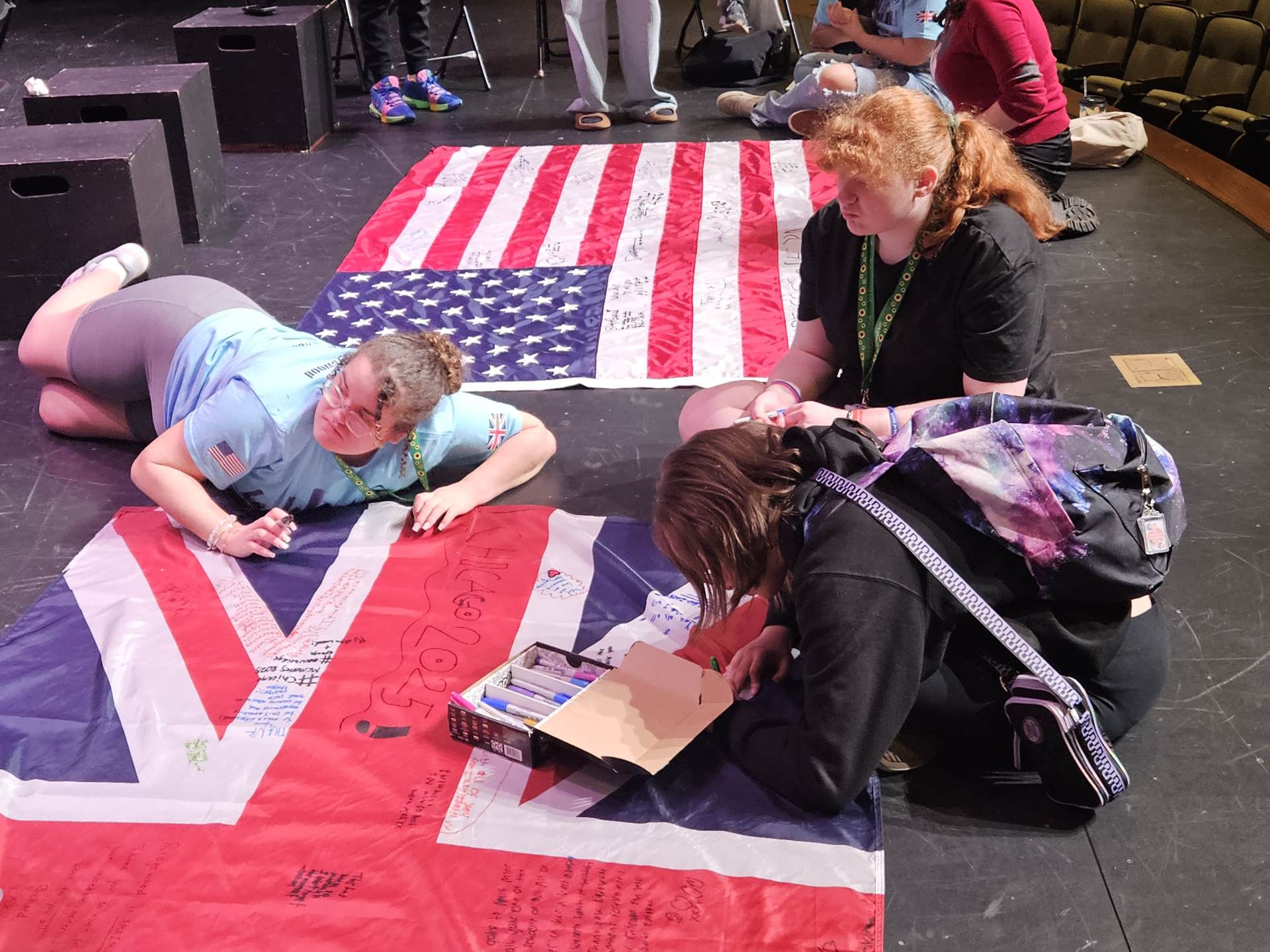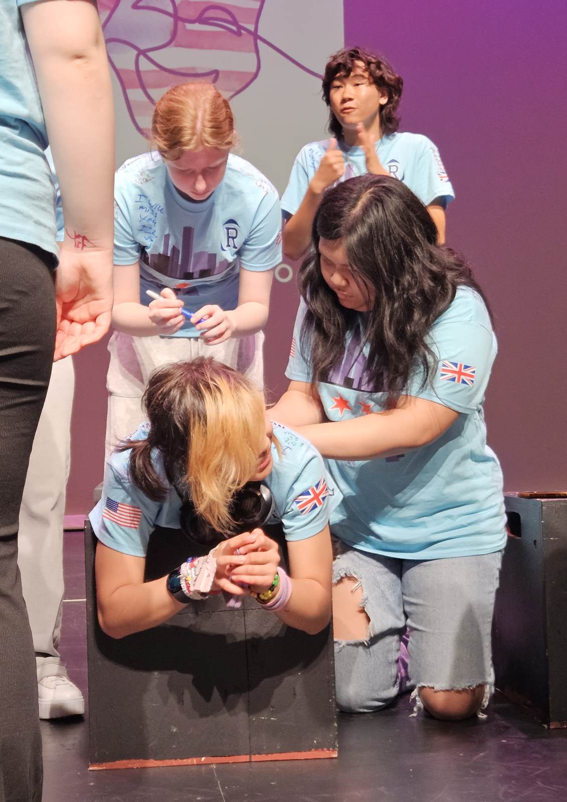 During the first section of the morning, New Bridge and Ridgewood students signed each other’s t-shirts, took selfies and lots of photographs, and the New Bridge students signed a Union Jack flag which was given to Ridgewood. In turn, Ridgewood students signed an American flag and presented it to us.