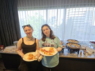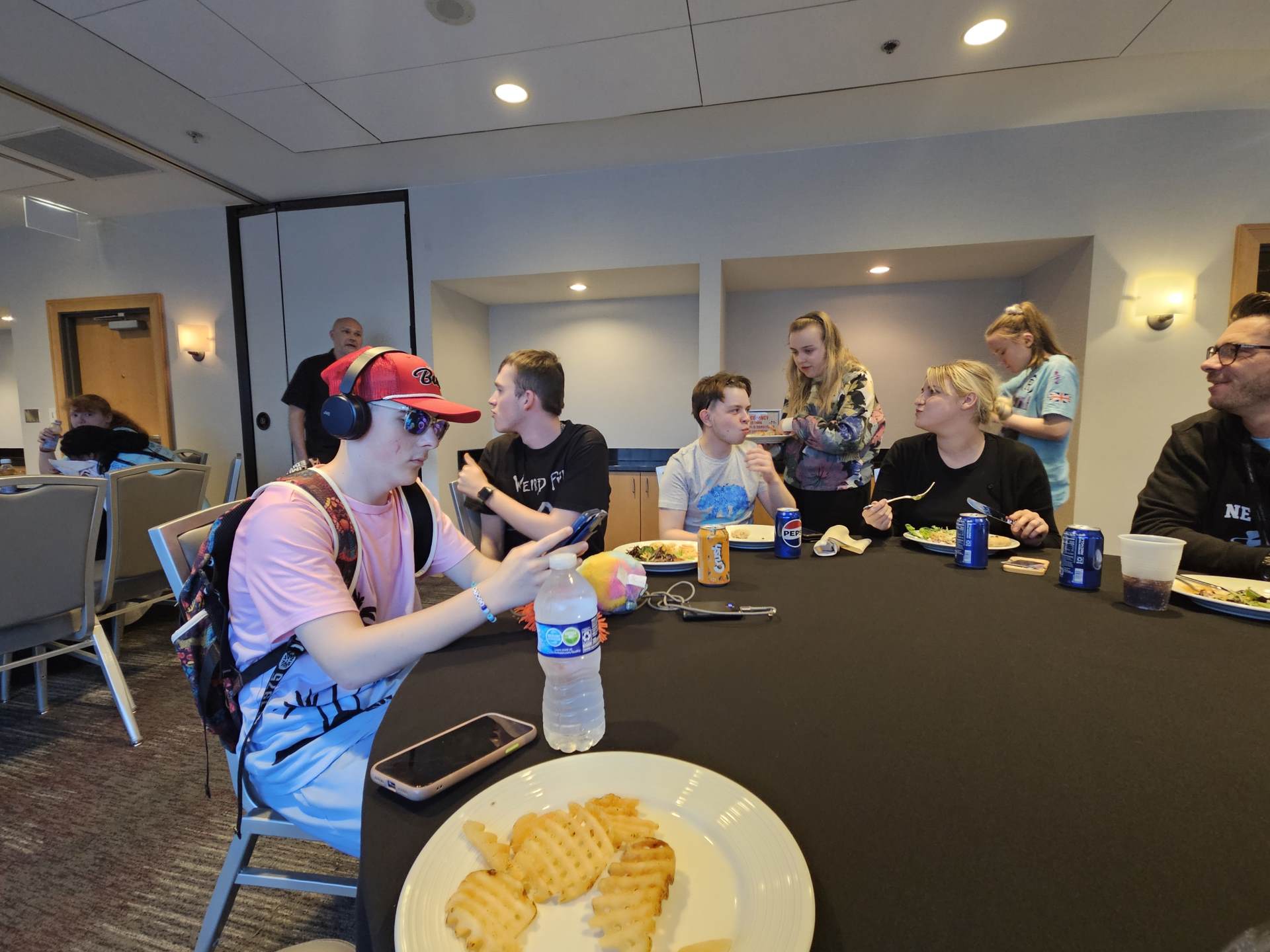 Tonight at the hotel, for our evening meal, the kitchen staff exclusively made us a variety of pizzas, waffle fries, salad and chocolate and vanilla ice cream.